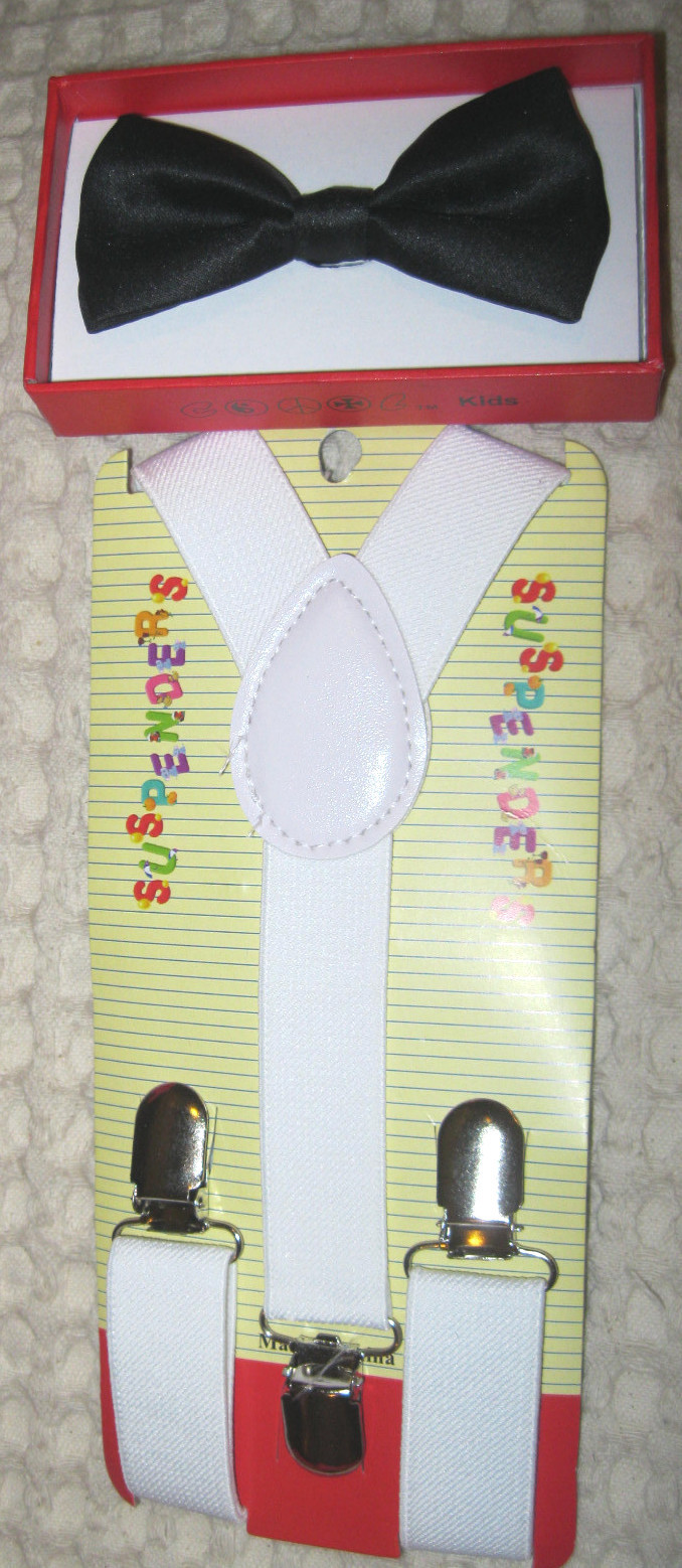 - UNISEX KID'S FASHION SOLID BLACK TUXEDO ADJUSTABLE ALL POLYESTER SILK BOW TIE-NEW IN FACTORY BOX AND SOLID WHITE ADJUSTABLE SUSPENDERS!