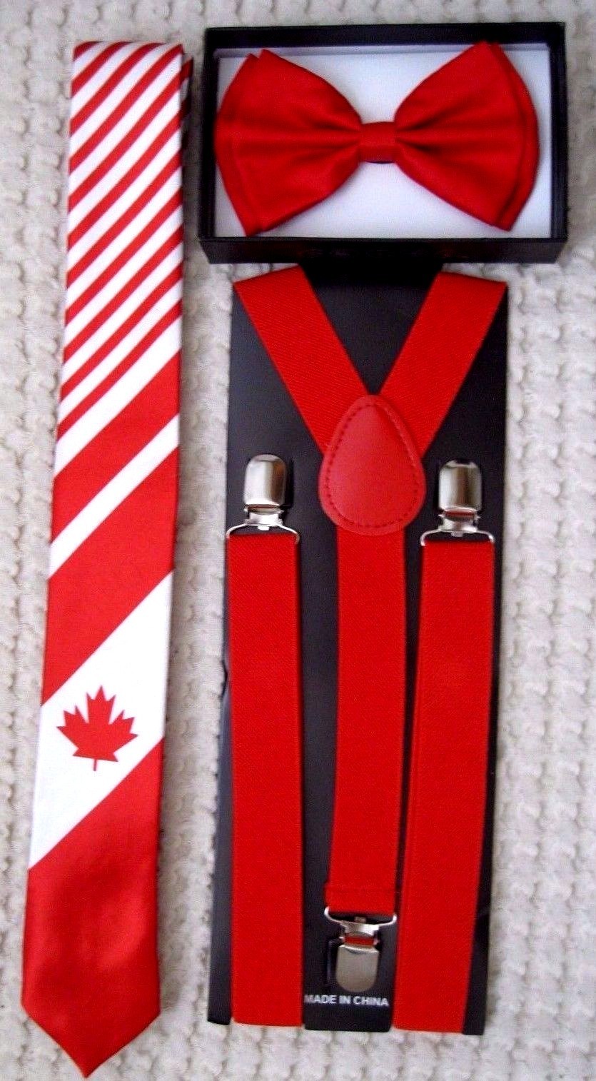 Canadian Canada Flag with Stripes 2" Necktie,Red Bow Tie and Red 1" Suspenders