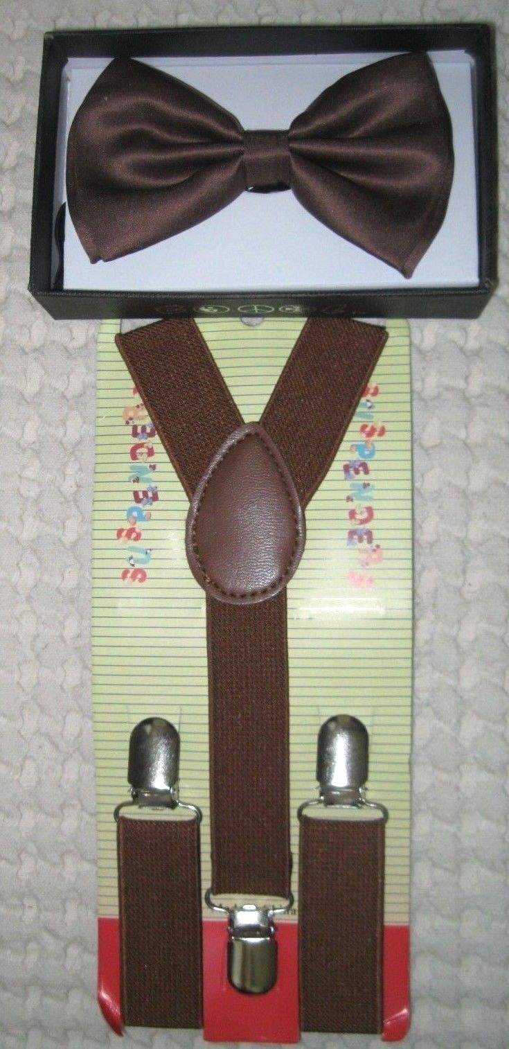 - UNISEX KID'S FASHION BROWN TUXEDO ADJUSTABLE ALL POLYESTER SILK BOW TIE-NEW IN FACTORY BOX AND SOLID BROWN ADJUSTABLE Y-BACK SUSPENDERS-BRAND NEW!