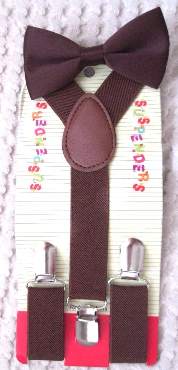 - UNISEX KID'S FASHION BROWN TUXEDO ADJUSTABLE ALL POLYESTER SILK BOW TIE-NEW IN FACTORY BOX AND SOLID BROWN ADJUSTABLE Y-BACK SUSPENDERS-BRAND NEW!