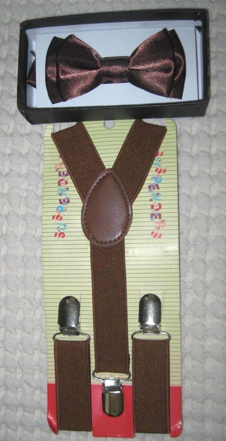- UNISEX KID'S FASHION BROWN TUXEDO ADJUSTABLE ALL POLYESTER SILK BOW TIE-NEW IN FACTORY BOX AND SOLID BROWN ADJUSTABLE Y-BACK SUSPENDERS-BRAND NEW!
