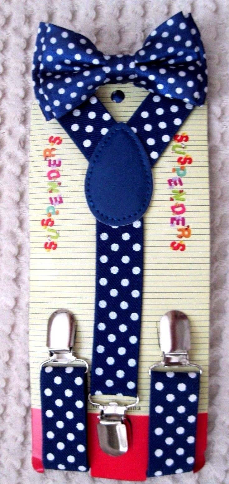 • UNISEX KID'S FASHION BLUE WITH WHITE POLKA DOT TUXEDO ADJUSTABLE ALL POLYESTER SILK BOW TIE-NEW IN FACTORY BOX AND BLUE WITH WHITE POLKA DOT ADJUSTABLE Y-BACK SUSPENDERS COMBO!