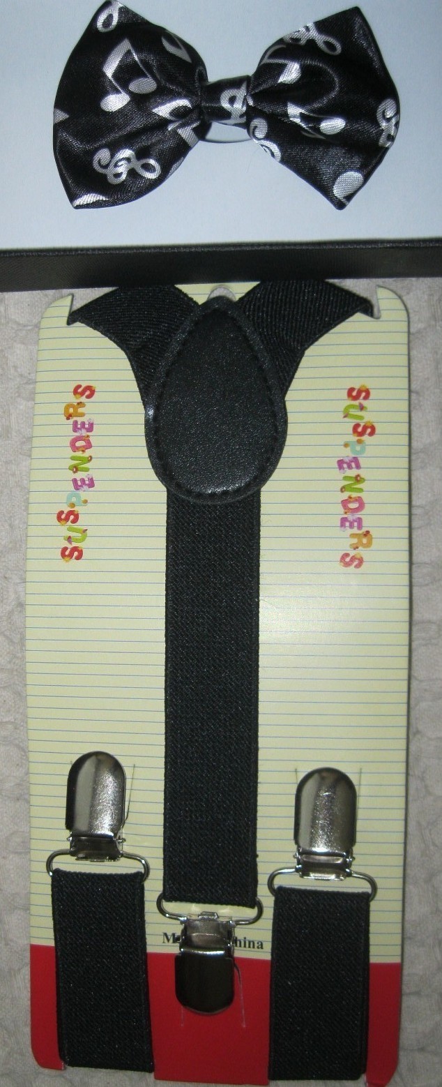 - UNISEX KID'S GIRLS/BOYS FASHION BLACK WITH WHITE MUSICAL NOTES TUXEDO ADJUSTABLE ALL POLYESTER SILK BOW TIE-NEW IN FACTORY BOX AND SOLID BLACK Y-BACK ADJUSTABLE ADJUSTABLE SUSPENDERS!