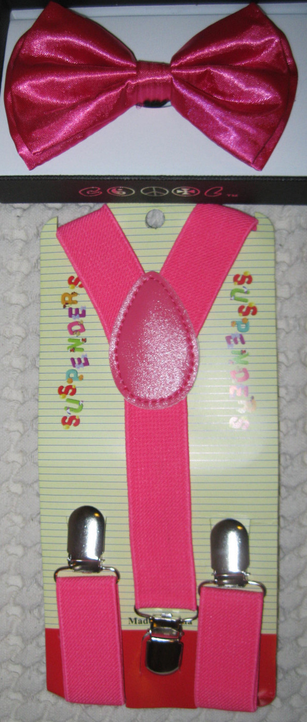 Kid's Boys Girls Pink Adjustable Bow Tie & Neon Pink Y-Back suspenders-New!