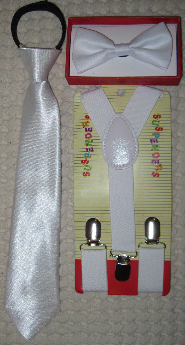 - UNISEX KID'S BOYS GIRLS FASHION SOLID BRIGHT WHITE TUXEDO ADJUSTABLE ALL POLYESTER SILK BOW TIE-NEW IN FACTORY BOX, SOLID BRIGHT WHITE 11 1/2" PRE-TIED ADJUSTABLE NECK TIE, AND SOLID BRIGHT WHITE ADJUSTABLE Y-BACK SUSPENDERS!