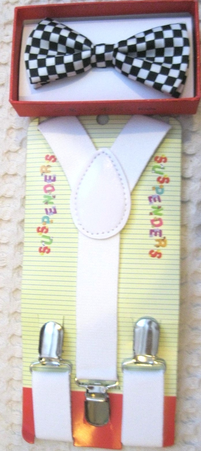- UNISEX KID'S FASHION BLACK AND WHITE CHECKERED CHECKERS TUXEDO ADJUSTABLE ALL POLYESTER SILK BOW TIE-NEW IN FACTORY BOX AND SOLID WHITE ADJUSTABLE SUSPENDERS!