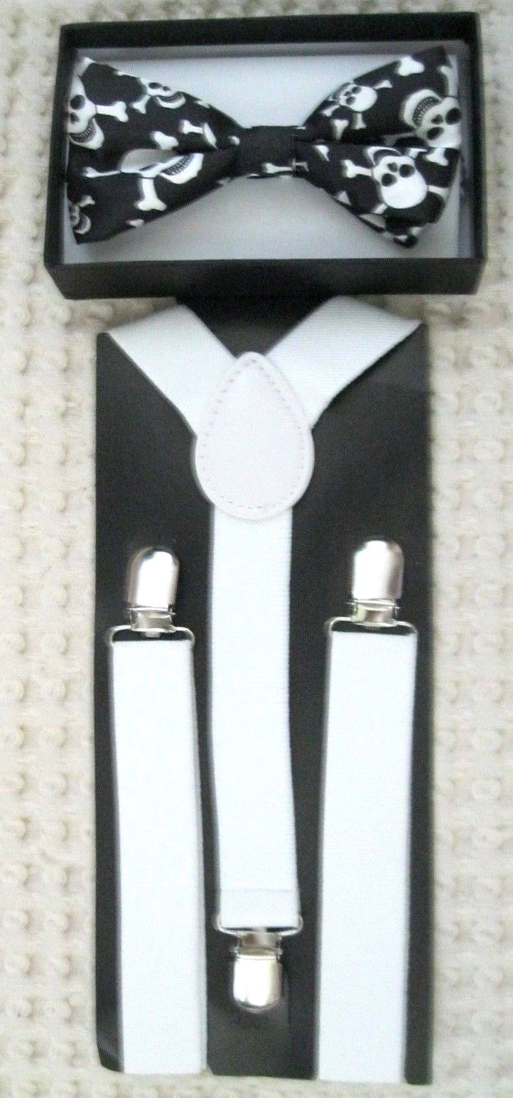 • UNISEX FASHION KIDS TEENS TEENAGERS BLACK WITH WHITE SKULLS AND CROSSBONES ADJUSTABLE ALL POLYESTER SILK PRE-TIED STRAP BOW TIE AND MATCHING KIDS TEENS TEENAGERS SOLID WHITE ADJUSTABLE SUSPENDERS COMBO-NEW IN FACTORY BOX!