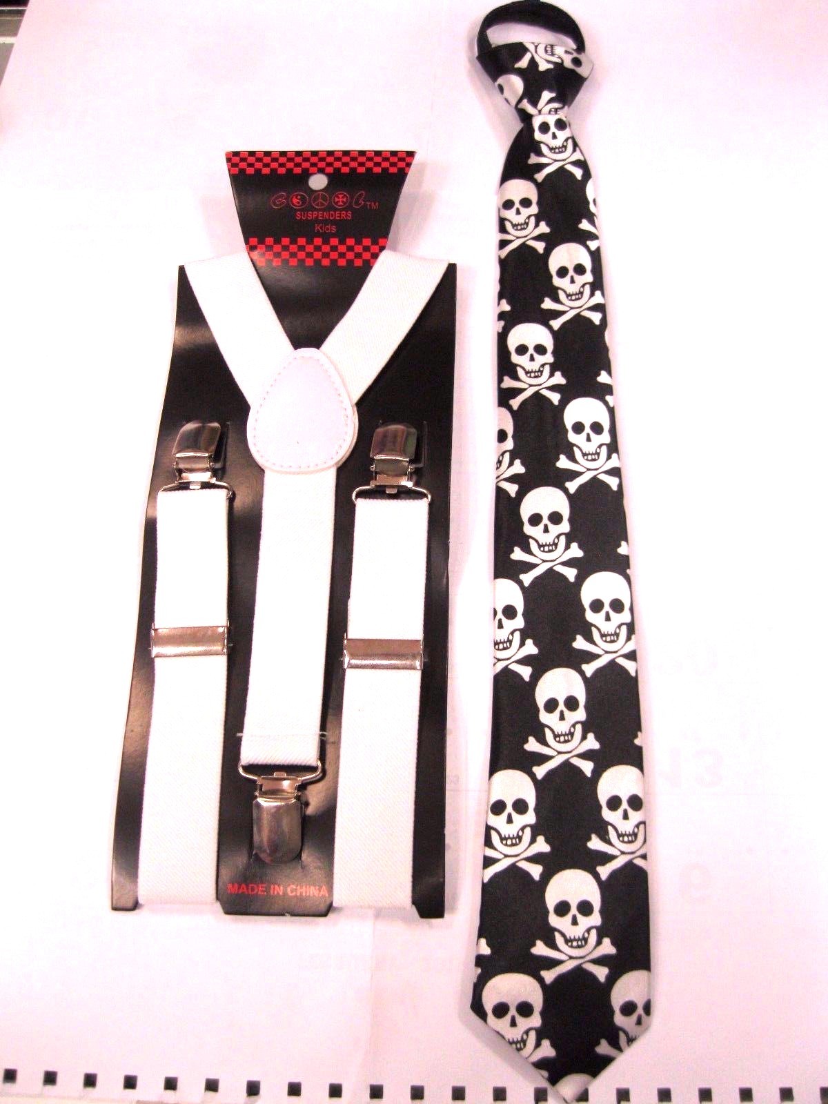 • UNISEX FASHION KIDS TEENS TEENAGERS BLACK WITH WHITE SKULLS AND CROSSBONES ADJUSTABLE ALL POLYESTER SILK 14" PRE-TIED NECKTIE AND MATCHING KIDS TEENS TEENAGERS SOLID WHITE ADJUSTABLE Y-BACK SUSPENDERS COMBO-NEW IN FACTORY BOX!