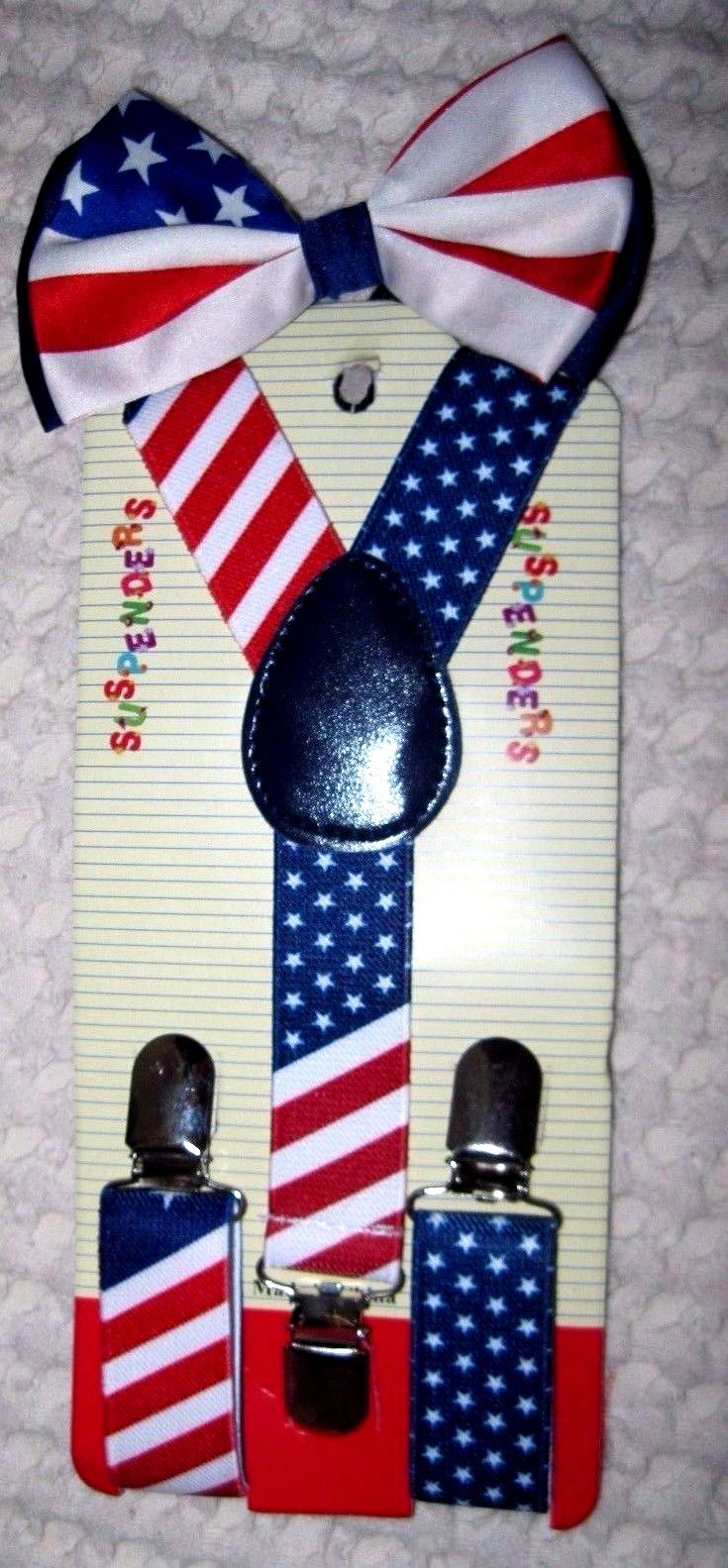 ADJUSTABLE ALL POLYESTER SILK BOW TIE AND MATCHING KIDS TEENAGERS US AMERICAN FLAG RED,WHITE,AND BLUE ADJUSTABLE Y-BACK SUSPENDERS COMBO-NEW IN FACTORY BOX!