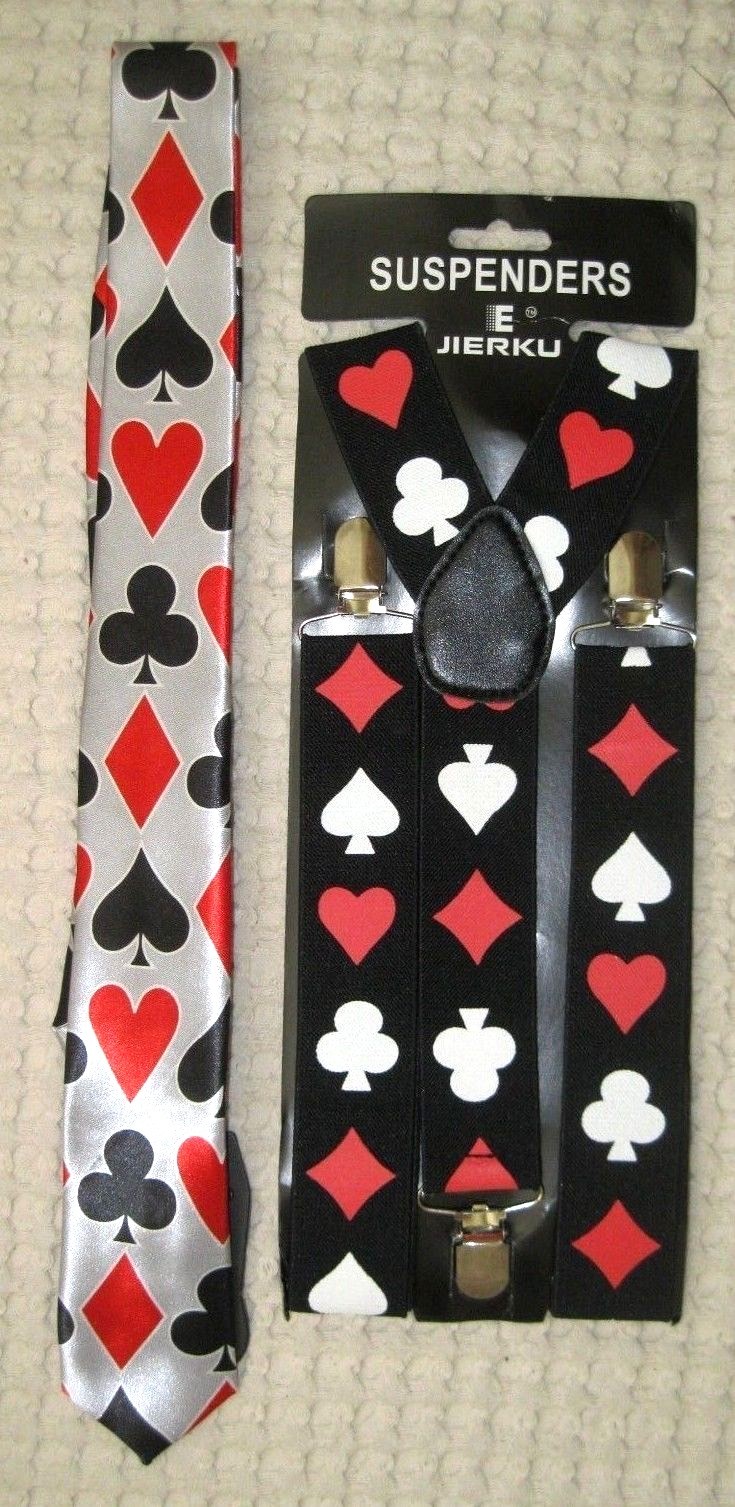 - UNISEX FASHION SHINY POKER SPADES,CLUBS,DIAMONDS, RED HEARTS PLAYING CARDS PATTERN ADJUSTABLE ALL POLYESTER SILK NECKTIE AND MATCHING 1 1/2" ADJUSTABLE Y-BACK SUSPENDERS, -NEW IN FACTORY BOX!