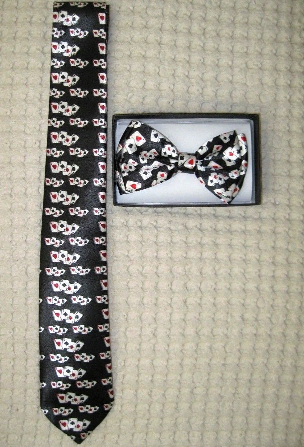- UNISEX FASHION SHINY POKER SPADES,CLUBS,DIAMONDS, RED HEARTS PLAYING CARDS PATTERN ADJUSTABLE ALL POLYESTER SILK BOW TIE AND POKER 4 ACES/4 OF A KIND ADJUSTABLE NECK TIE-NEW IN FACTORY BOX!