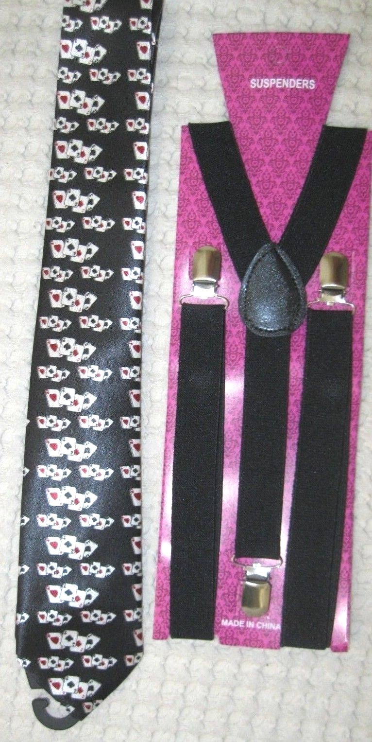 - UNISEX FASHION SHINY POKER SPADES,CLUBS,DIAMONDS, RED HEARTS PLAYING CARDS PATTERN ADJUSTABLE ALL POLYESTER SILK NECK TIE AND SOLID BACK 1" ADJUSTABLE Y-BACK SUSPENDERS-NEW IN FACTORY BOX!