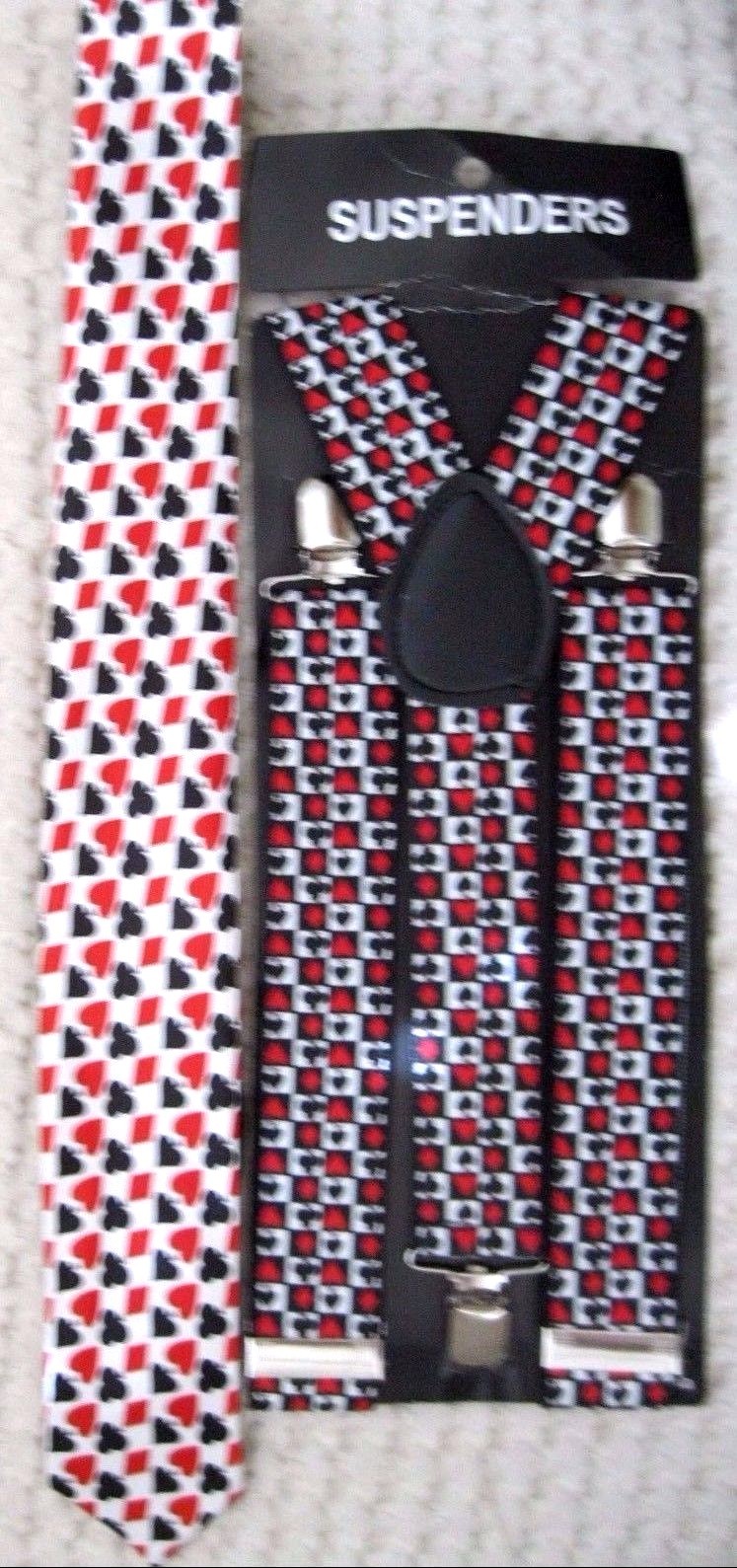 - UNISEX FASHION SHINY POKER SPADES,CLUBS,DIAMONDS, RED HEARTS PLAYING CARDS PATTERN ADJUSTABLE ALL POLYESTER SILK NECKTIE AND MATCHING 1" Y-BACK ADJUSTABLE SUSPENDERS COMBO-NEW!