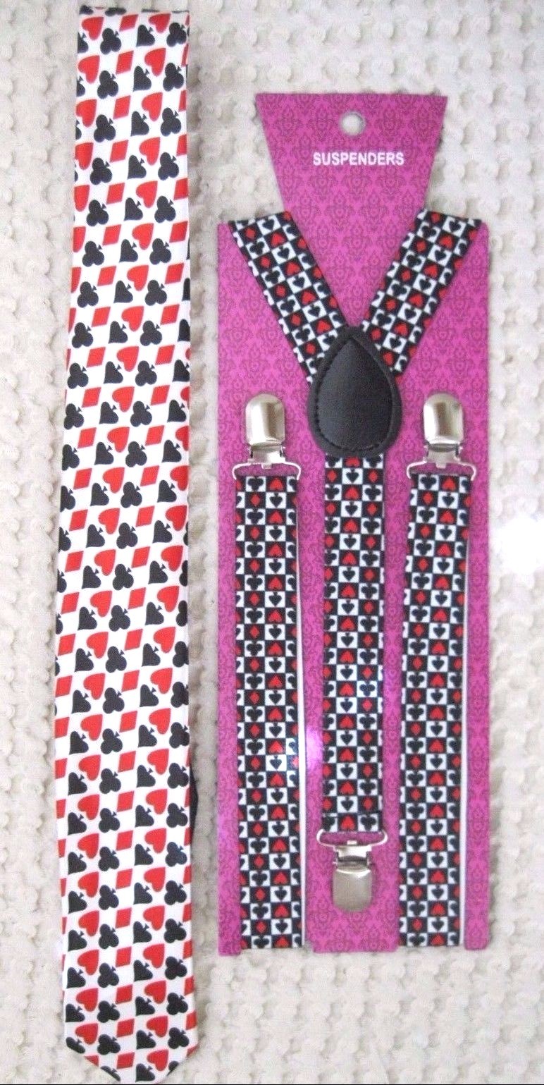 • UNISEX FASHION SHINY POKER SPADES,CLUBS,DIAMONDS, RED HEARTS PLAYING CARDS PATTERN ADJUSTABLE ALL POLYESTER SILK NECKTIE AND MATCHING 1" Y-BACK ADJUSTABLE SUSPENDERS COMBO-NEW!