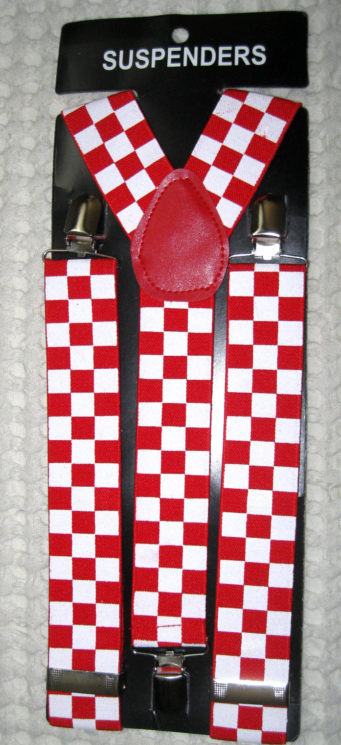 • RED AND WHITE CHECKER CHECKERED DIAMONDS ADJUSTABLE SUSPENDERS-BRAND NEW IN FACTORY PACKAGE!