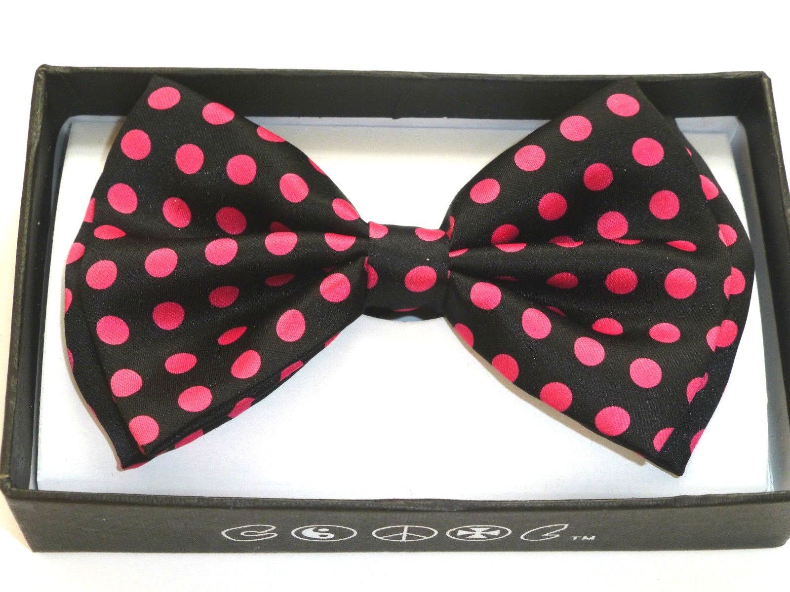 • UNISEX FASHION BLACK WITH LARGE PINK POLKA DOTS ADJUSTABLE ALL POLYESTER SILK BOW TIE-NEW IN FACTORY BOX! (VERS2A)