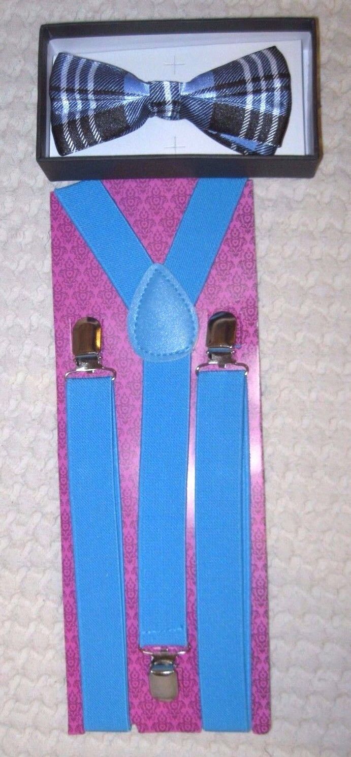 • UNISEX FASHION BLUE PLAID TUXEDO ADJUSTABLE ALL POLYESTER SILK BOW TIE-NEW IN FACTORY BOX AND BLUE ADJUSTABLE Y-BACK SUSPENDERS COMBO!