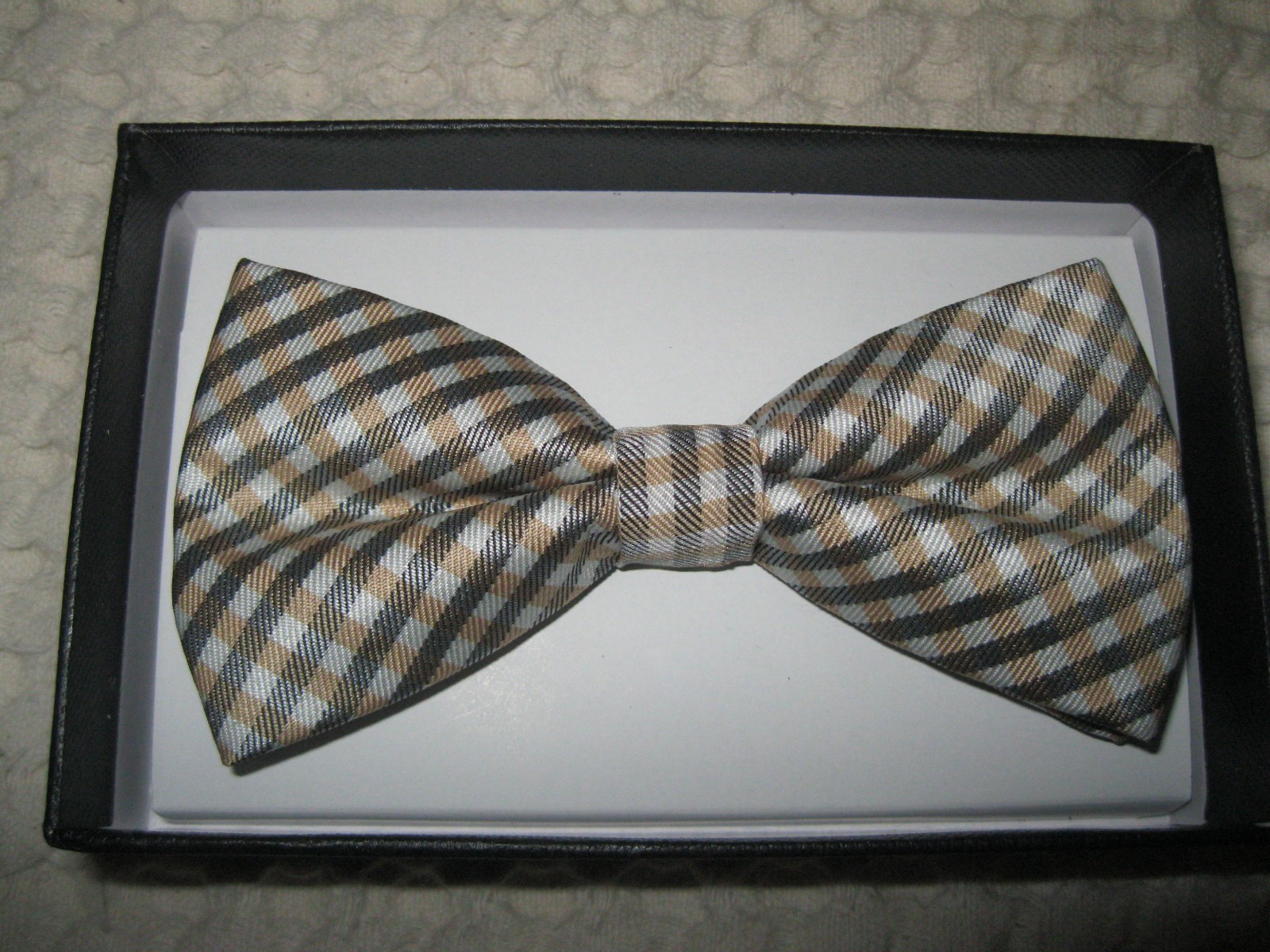• UNISEX FASHION BLACK BROWN BEIGE WHITE PLAID DESIGN TUXEDO ADJUSTABLE ALL POLYESTER SILK BOWTIE-NEW IN FACTORY BOX!