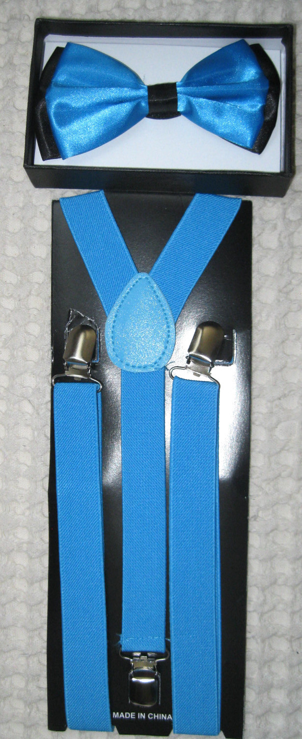 - UNISEX FASHION FRENCH BLUE WITH BLACK END TIPS TUXEDO ADJUSTABLE ALL POLYESTER SILK BOW TIE-NEW IN FACTORY BOX AND SOLID FRENCH BLUE ADJUSTABLE SUSPENDERS COMBO!