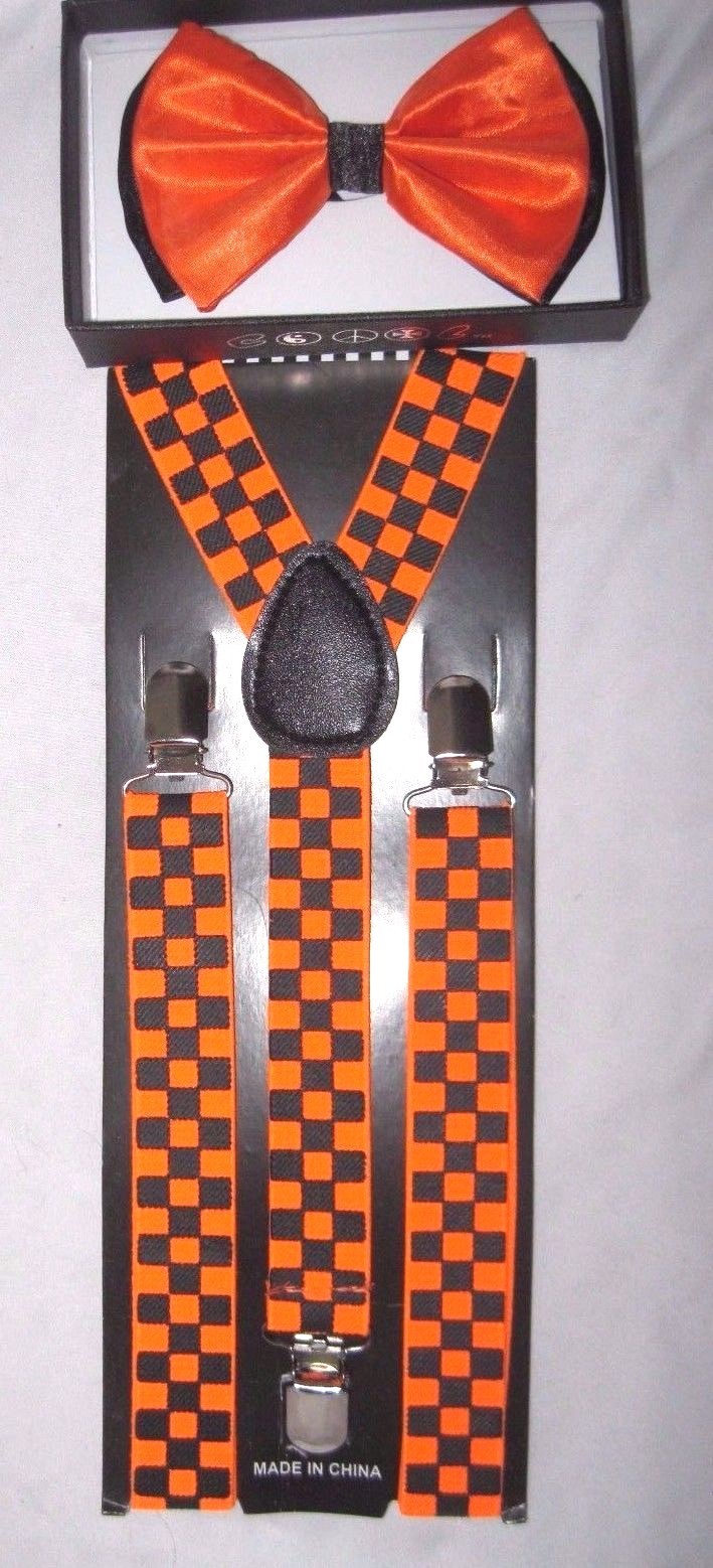 • UNISEX FASHION NEON ORANGE WITH BLACK END TIPS TUXEDO ADJUSTABLE ALL POLYESTER SILK BOW TIE-NEW IN FACTORY BOX AND NEON ORANGE AND BLACK CHECKERS CHECKERED DIAMONDS ADJUSTABLE SUSPENDERS COMBO!