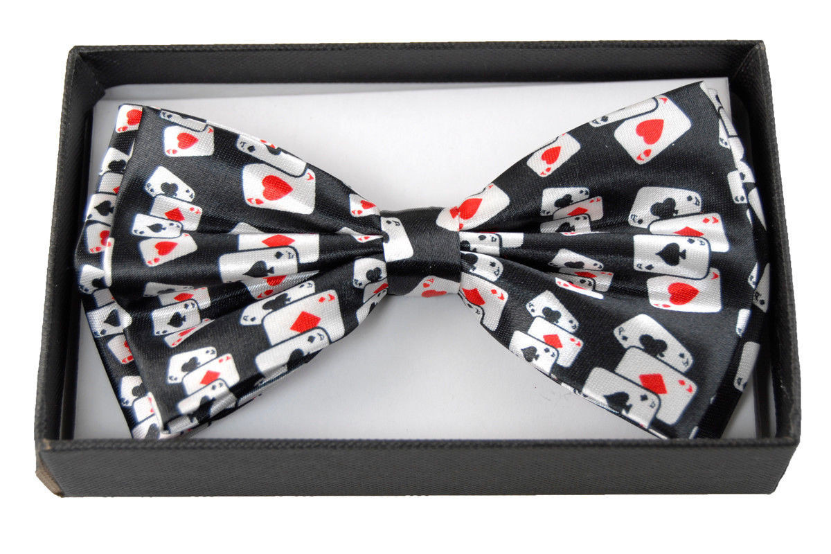 - UNISEX FASHION SHINY POKER FOUR OF A KIND ACES PLAYING CARDS PATTERN ADJUSTABLE ALL POLYESTER SILK BOW TIE-NEW IN FACTORY BOX!