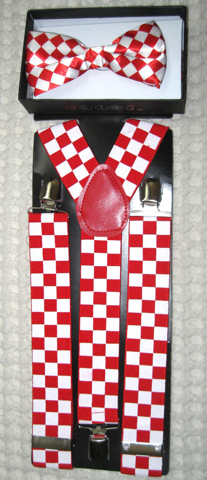 - UNISEX FASHION RED AND WHITE CHECKER CHECKERED DIAMONDS TUXEDO ADJUSTABLE ALL POLYESTER SILK BOW TIE-NEW IN FACTORY BOX AND RED AND WHITE CHECKER CHECKERED DIAMONDS ADJUSTABLE SUSPENDERS COMBO!