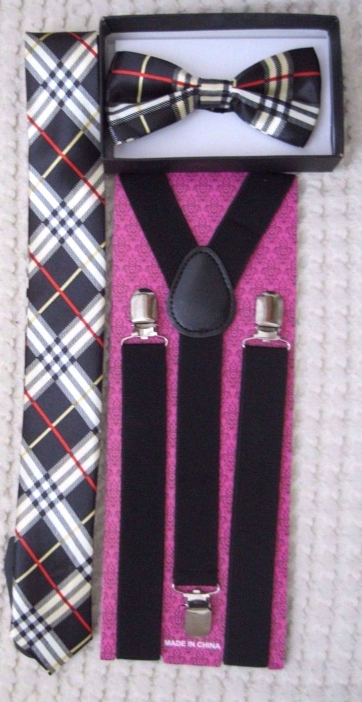 • UNISEX FASHION BLACK GARGOYLE BOW TIE, BLACK PLAID GARGOYLE NECKTIE AND SOLID BLACK ADJUSTABLE SUSPENDERS COMBO-NEW IN FACTORY BOX!