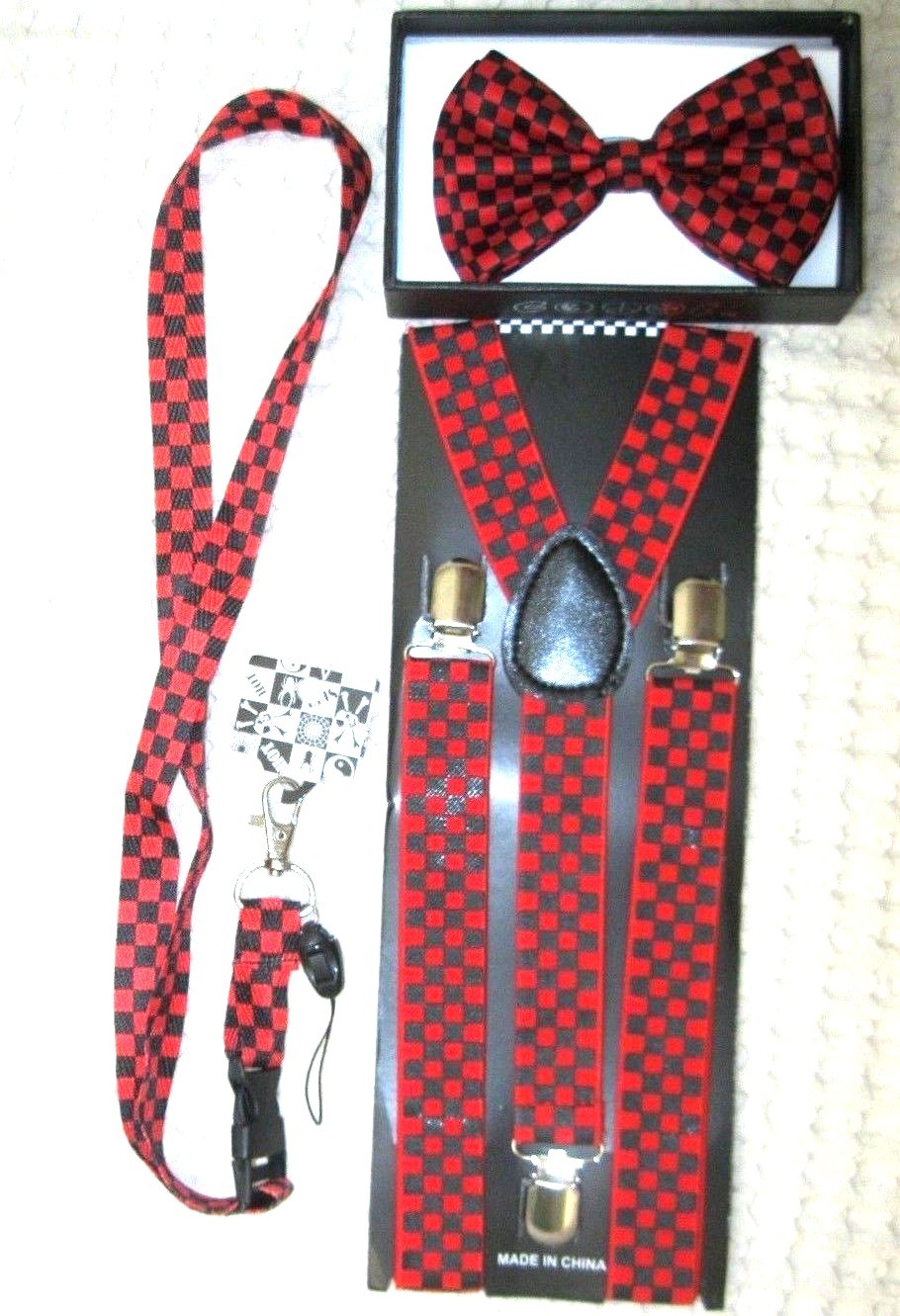 Black&Red Checkers Bow tie,Black&Red Lanyard,& 1" B&R Checkered Suspenders-v4