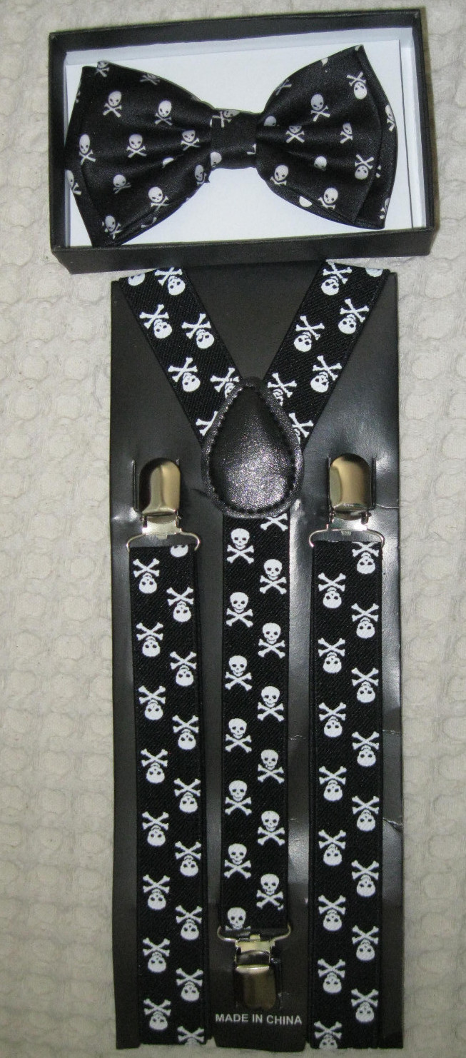 - UNISEX FASHION SOLID BLACK WITH WHITE SKULLS AND CROSSBONES ADJUSTABLE ALL POLYESTER SILK PRE-TIED STRAP BOW TIE AND SOLID BLACK WITH SMALL WHITE SKULLS AND CROSSBONES ADJUSTABLE SUSPENDERS COMBO-NEW IN FACTORY BOX!