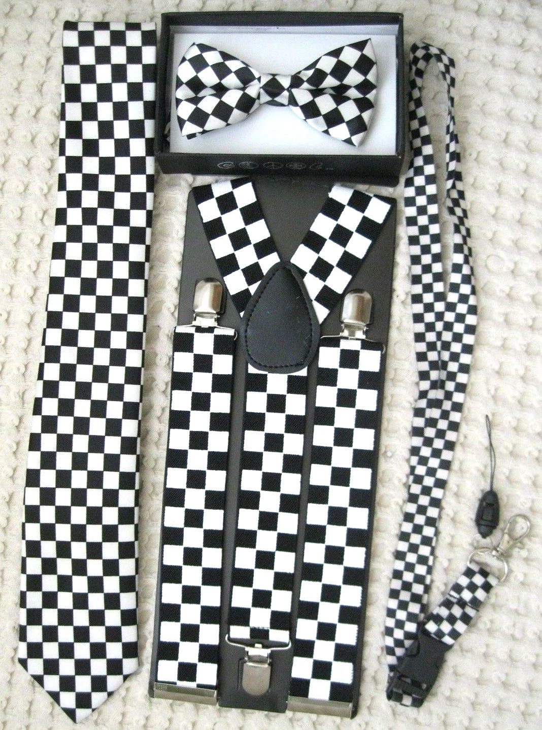 • UNISEX FASHION BLACK AND WHITE CHECKERS CHECKERED ADJUSTABLE ALL POLYESTER SILK BOW TIE,MATCHING NECK TIE, AND WIDE 1 1/2" ADJUSTABLE SUSPENDERS, AND
