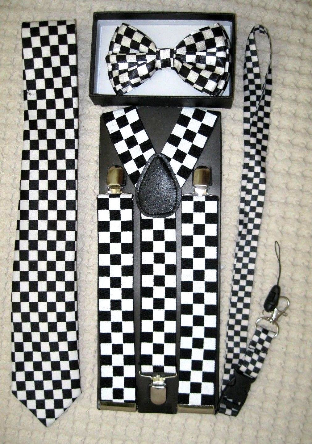 • UNISEX FASHION BLACK AND WHITE CHECKERS CHECKERED ADJUSTABLE ALL POLYESTER SILK BOW TIE,MATCHING NECK TIE, AND WIDE 1 1/2" ADJUSTABLE SUSPENDERS, AND