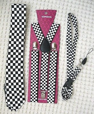 UNISEX FASHION BLACK AND WHITE CHECKERS CHECKERED ADJUSTABLE ALL POLYESTER SILK NECK TIE,BLACK AND WHITE CHECKERS CHECKERED ID HOLDER KEYCHAIN LANYARD, AND BLACK AND WHITE CHECKERS CHECKERED WIDE 1 1/2" ADJUSTABLE SUSPENDERS