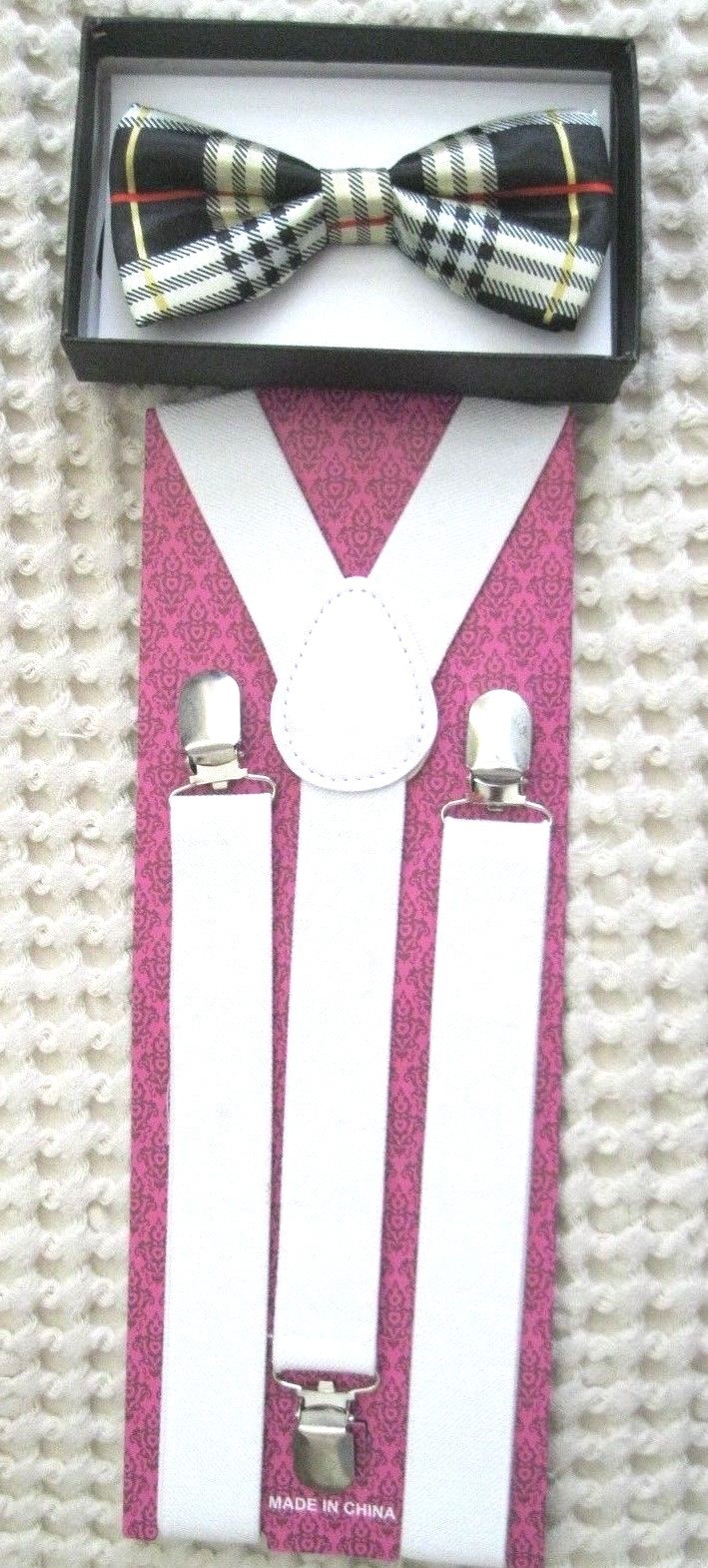 - UNISEX FASHION BLACK WHITE BEIGE TAN PLAID ADJUSTABLE ALL POLYESTER SILK BOW TIE AND WHITE SUSPENDERS COMBO-NEW IN FACTORY BOX!