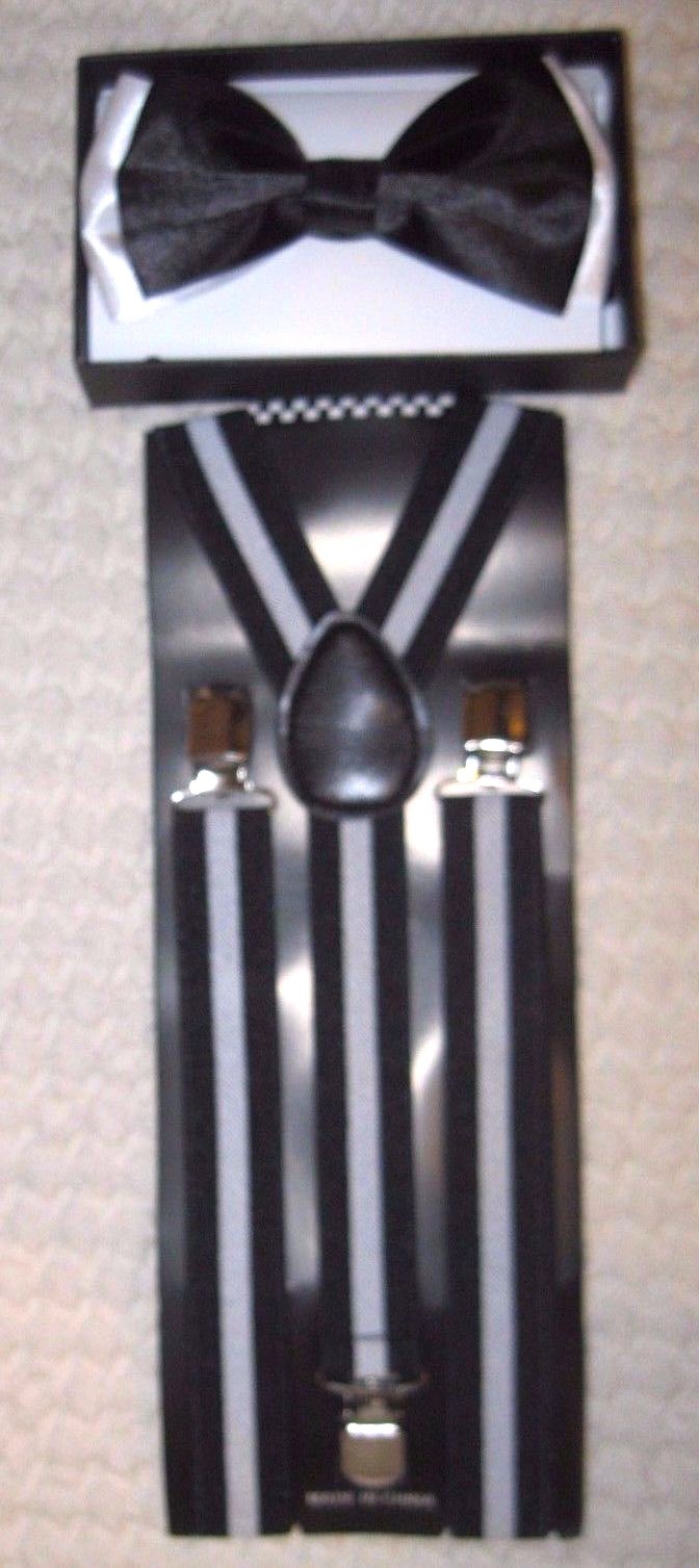 • UNISEX FASHION BLACK AND WHITE TIPS ADJUSTABLE ALL POLYESTER SILK BOW TIE AND BLACK AND WHITE STRIPES ADJUSTABLE Y-BACK SUSPENDERS COMBO-NEW IN FACTORY BOX!