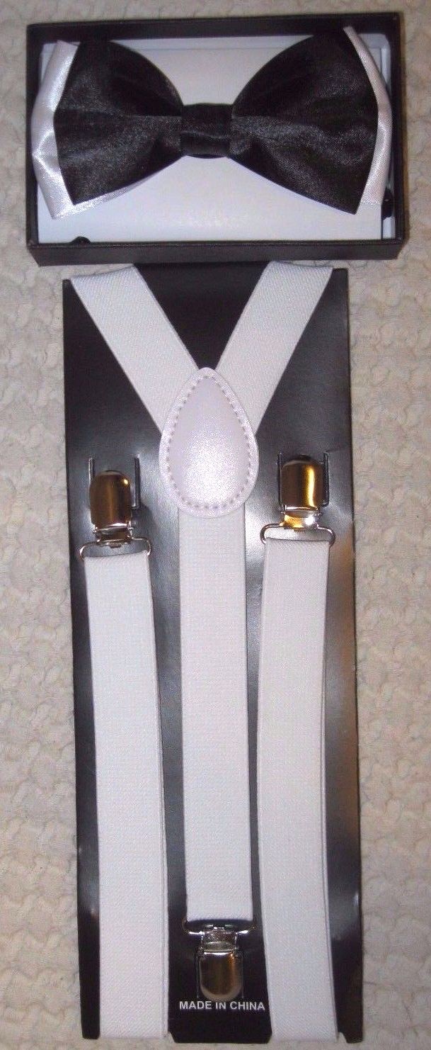 - UNISEX FASHION BLACK AND WHITE TIPS ADJUSTABLE ALL POLYESTER SILK BOW TIE AND WHITE ADJUSTABLE Y-BACK SUSPENDERS COMBO-NEW IN FACTORY BOX!