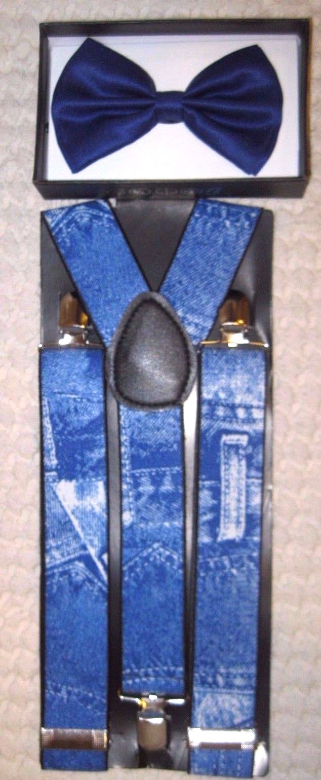 • UNISEX FASHION SOLID BLUE ADJUSTABLE ALL POLYESTER SILK BOW TIE AND BLUE JEANS PRINT PATTERN 1 1/2" WIDE ADJUSTABLE Y-BACK SUSPENDERS COMBO-NEW IN FACTORY BOX!