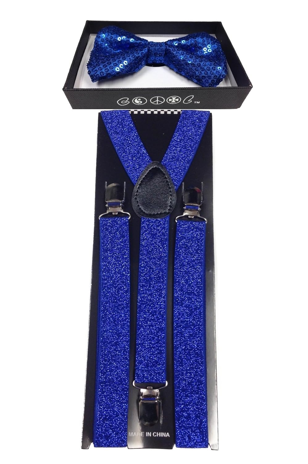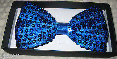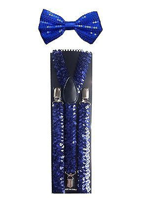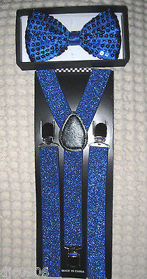- UNISEX FASHION BRIGHT BLUE SEQUIN ADJUSTABLE ALL POLYESTER SILK BOW TIE AND SOLID NEON BLUE GLITTERED SUSPENDERS COMBO-NEW IN FACTORY BOX!
