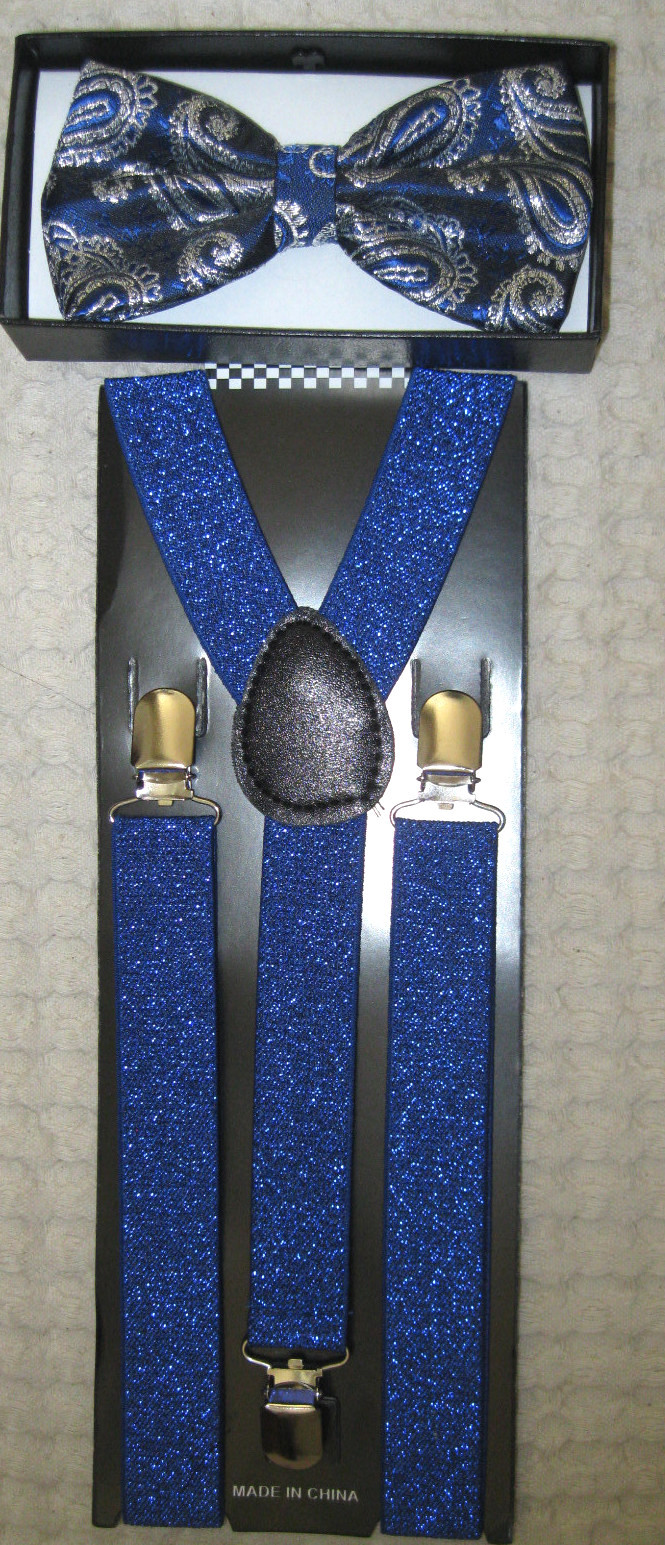 • UNISEX FASHION DARK ROYAL BLUE SILVER PAISLEY PATTERN DESIGN  ADJUSTABLE ALL POLYESTER SILK BOW TIE AND SOLID BLUE GLITTERED GLITTER ADJUSTABLE HEAVY DUTY SUSPENDERS-BRAND NEW FACTORY SEALED!