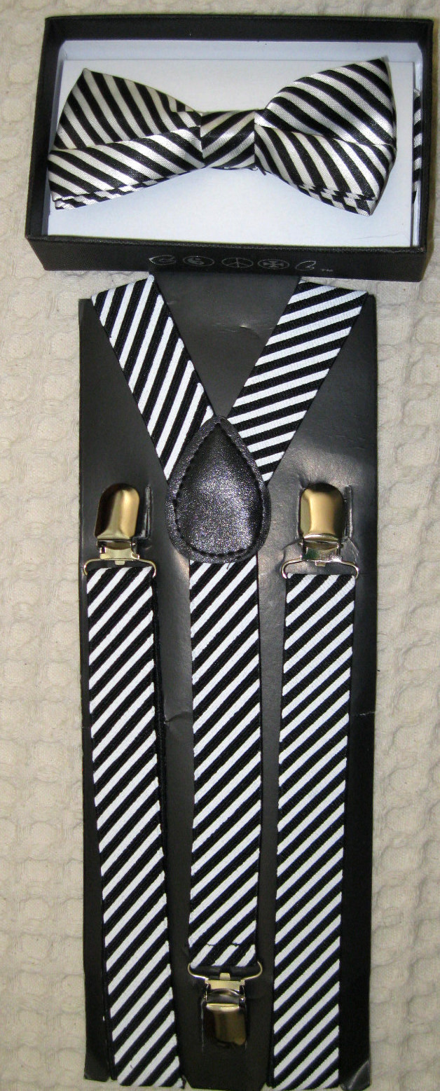 UNISEX FASHION WHITE WITH DIAGONAL BLACK STRIPES PATTERN ADJUSTABLE ALL POLYESTER SILK BOW TIE AND WHITE WITH DIAGONAL BLACK STRIPES ADJUSTABLE SUSPENDERS-NEW IN FACTORY BOX!