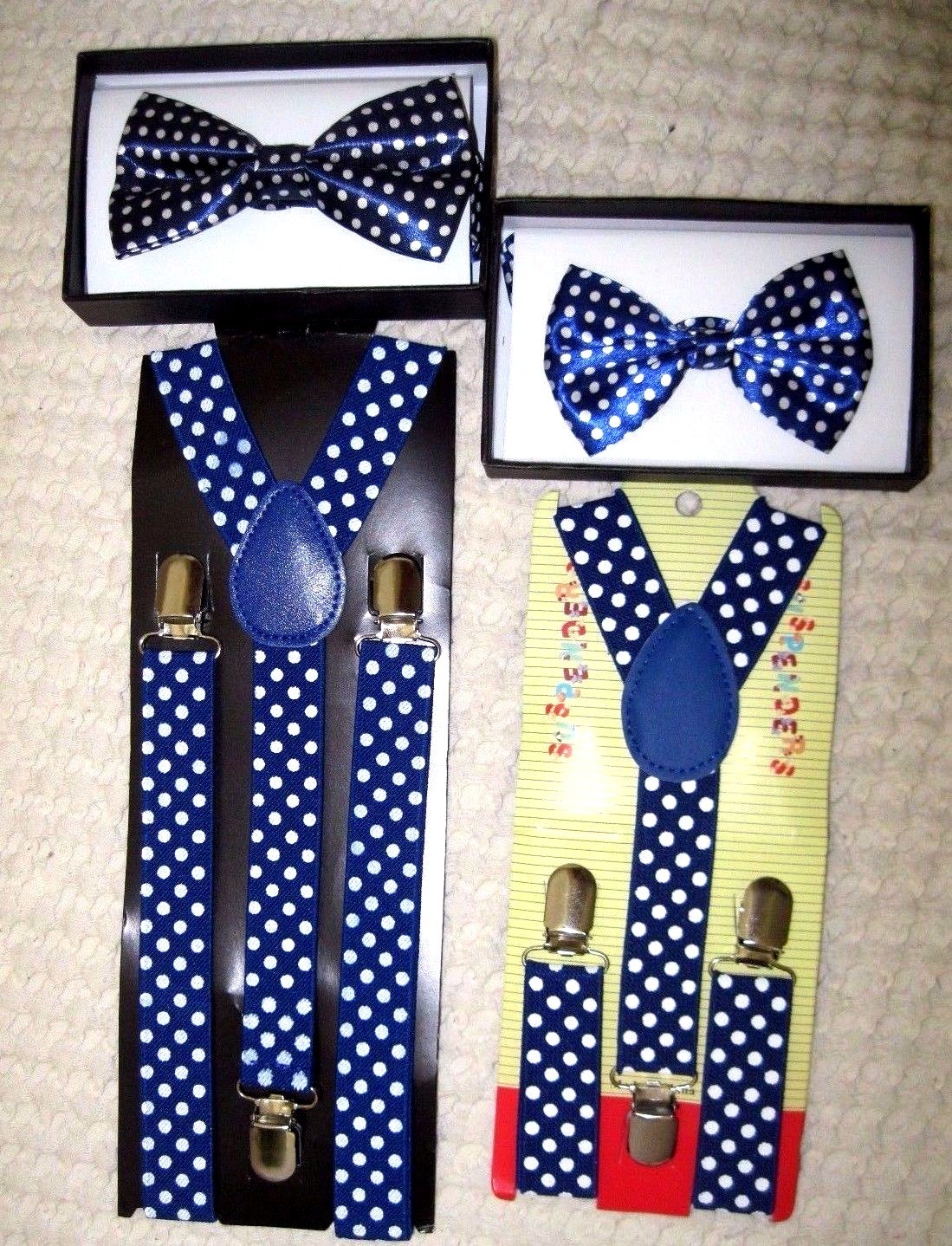 FATHER AND SON FASHION SOLID BLUE WITH WHITE POLKA DOTS ADJUSTABLE ALL POLYESTER SILK BOW TIE AND Y-BACK ADJUSTABLE SUSPENDERS COMBO-NEW IN FACTORY BOX!