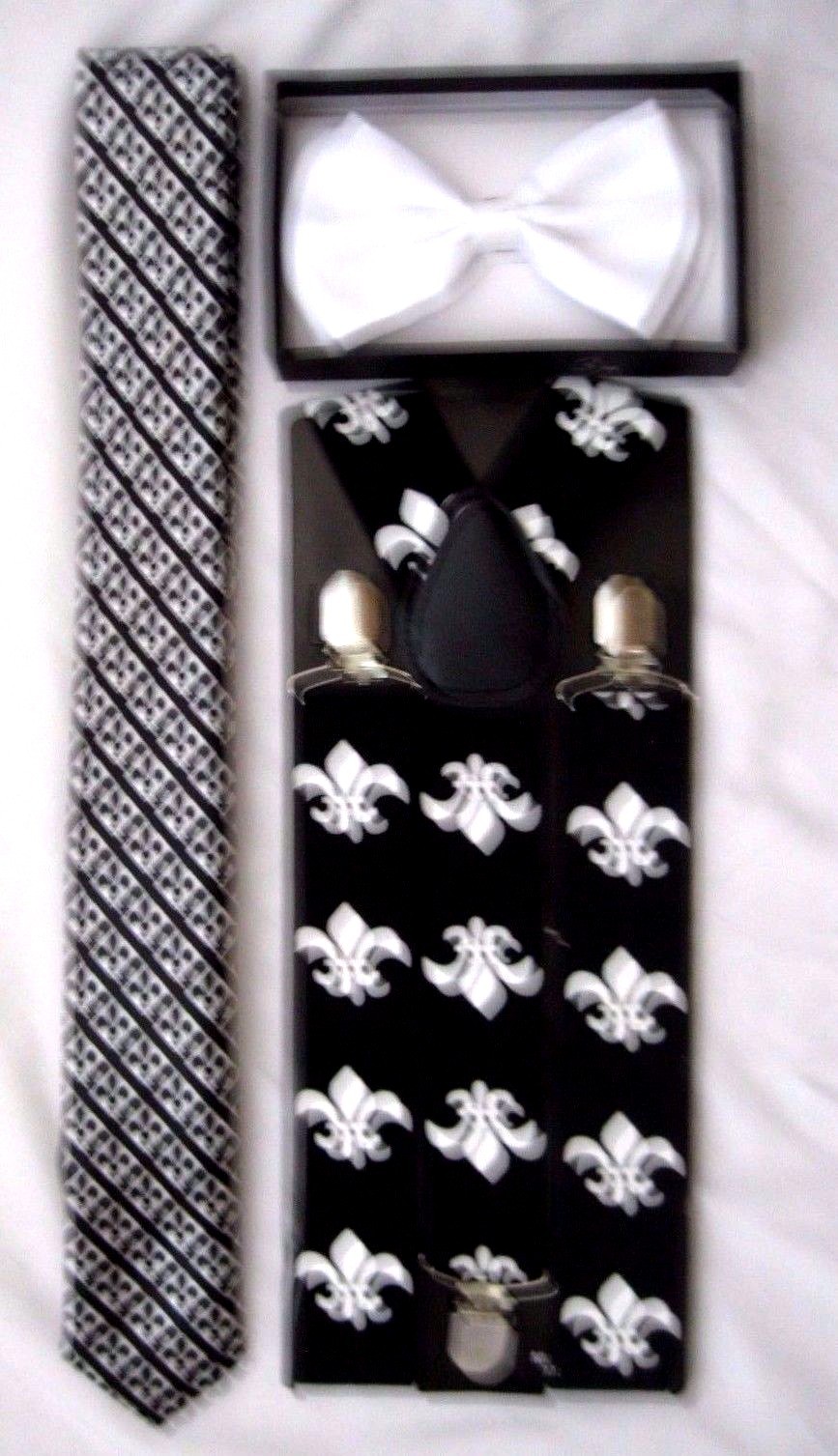 • UNISEX FASHION SOLID WHITE  ADJUSTABLE ALL POLYESTER SILK BOW TIE AND FLEUR DE LIS NEW ORLEANS SAINTS LOGO NECKTIE, AND FLEUR DE LIS NEW ORLEANS SAINTS LOGO WIDE 1 1/2" ADJUSTABLE HEAVY DUTY SUSPENDERS-BRAND NEW FACTORY SEALED!