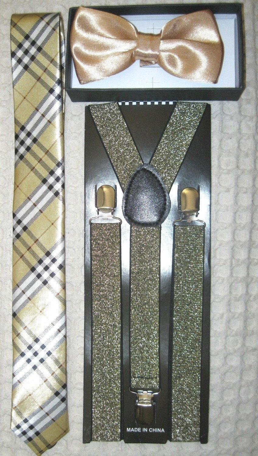 UNISEX FASHION SOLID SHINY GOLD ADJUSTABLE ALL POLYESTER SILK BOW TIE, GOLD GARGOYLE NECKTIE, WITH AND SOLID TAN/BEIGE GLITTERED SUSPENDERS COMBO-NEW IN FACTORY BOX!