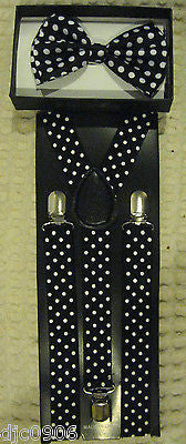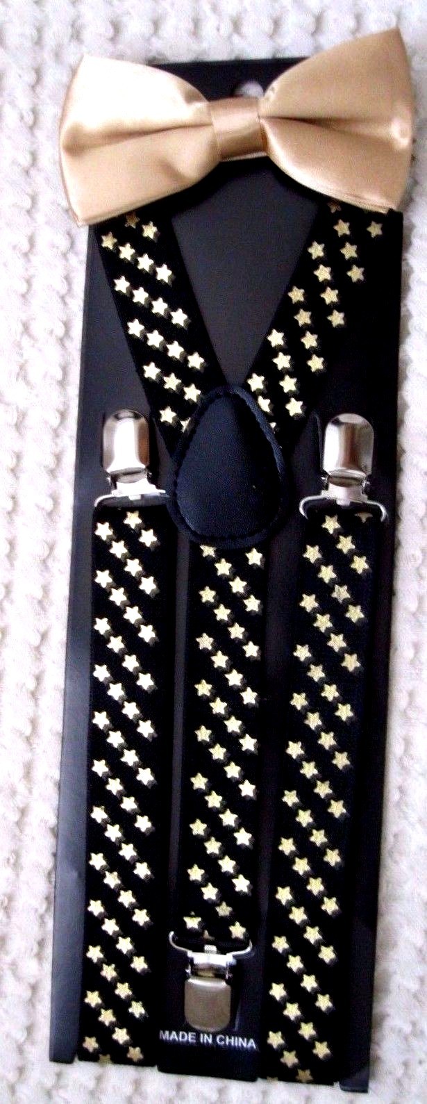 • UNISEX FASHION SOLID GOLD ADJUSTABLE ALL POLYESTER SILK BOW TIE AND SOLID BLACK WITH GOLD STARS Y-BACK ADJUSTABLE SUSPENDERS COMBO-NEW IN FACTORY BOX!