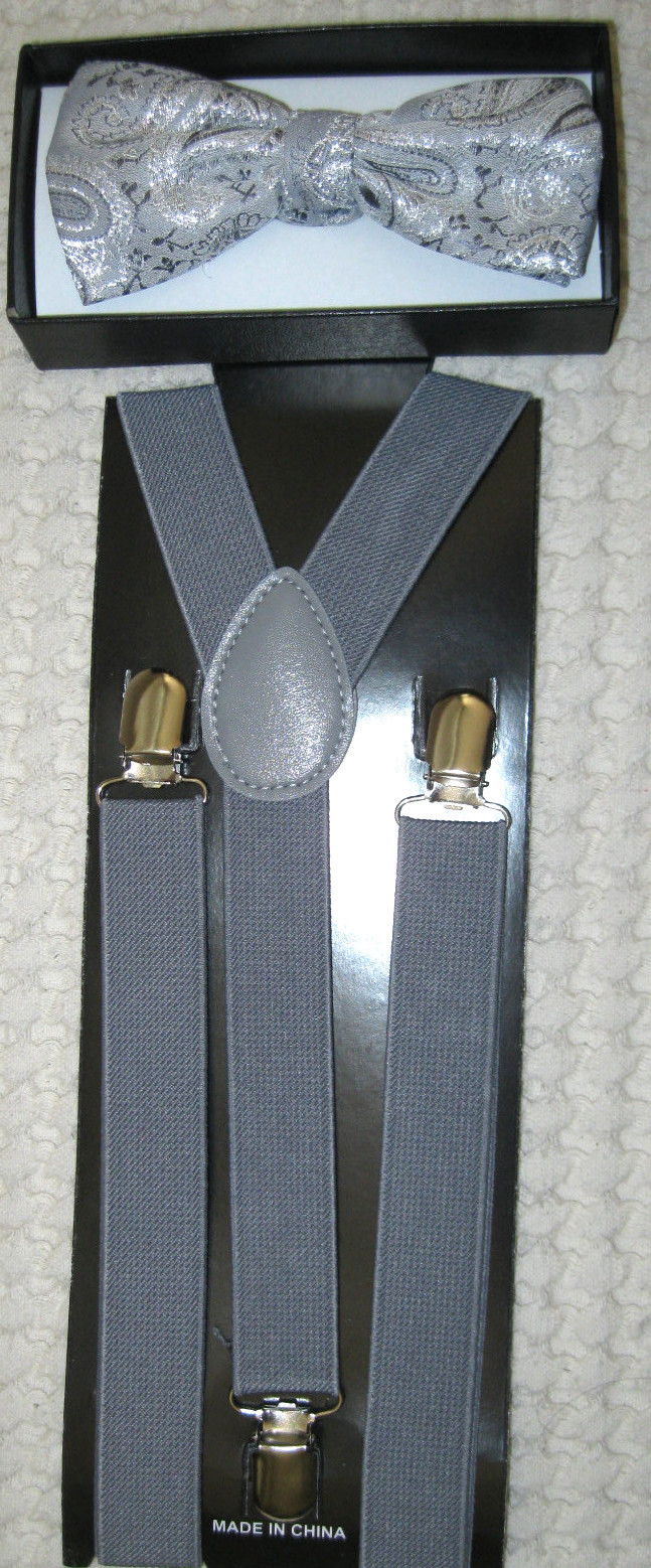 • UNISEX FASHION GRAY GREY SILVER PAISLEY PATTERN DESIGN  ADJUSTABLE ALL POLYESTER SILK BOW TIE AND SOLID GRAY GREY ADJUSTABLE HEAVY DUTY SUSPENDERS-BRAND NEW FACTORY SEALED!