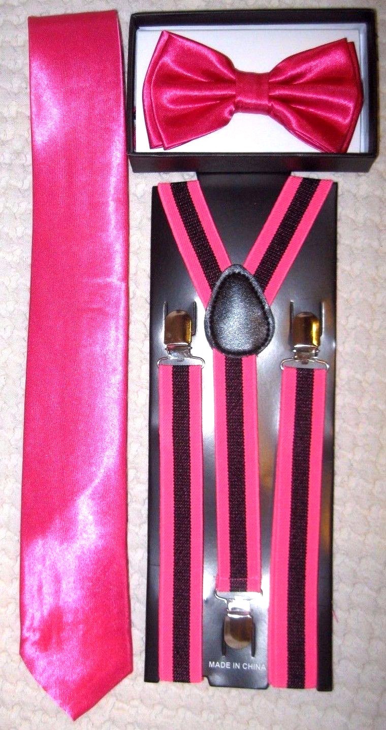 UNISEX FASHION SOLID SHINY HOT PINK ADJUSTABLE ALL POLYESTER SILK BOW TIE, HOT PINK NECKTIE, WITH AND SOLID HOT PINK AND BLACK STRIPES SUSPENDERS Y-BACK COMBO-NEW IN FACTORY BOX!