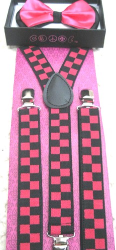 - UNISEX FASHION HOT PINK WITH BLACK CENTER AND TIPS ADJUSTABLE ALL POLYESTER SILK BOW TIE AND PINK AND BLACK CHECKERED CHECKER SUSPENDERS COMBO-NEW IN FACTORY BOX!