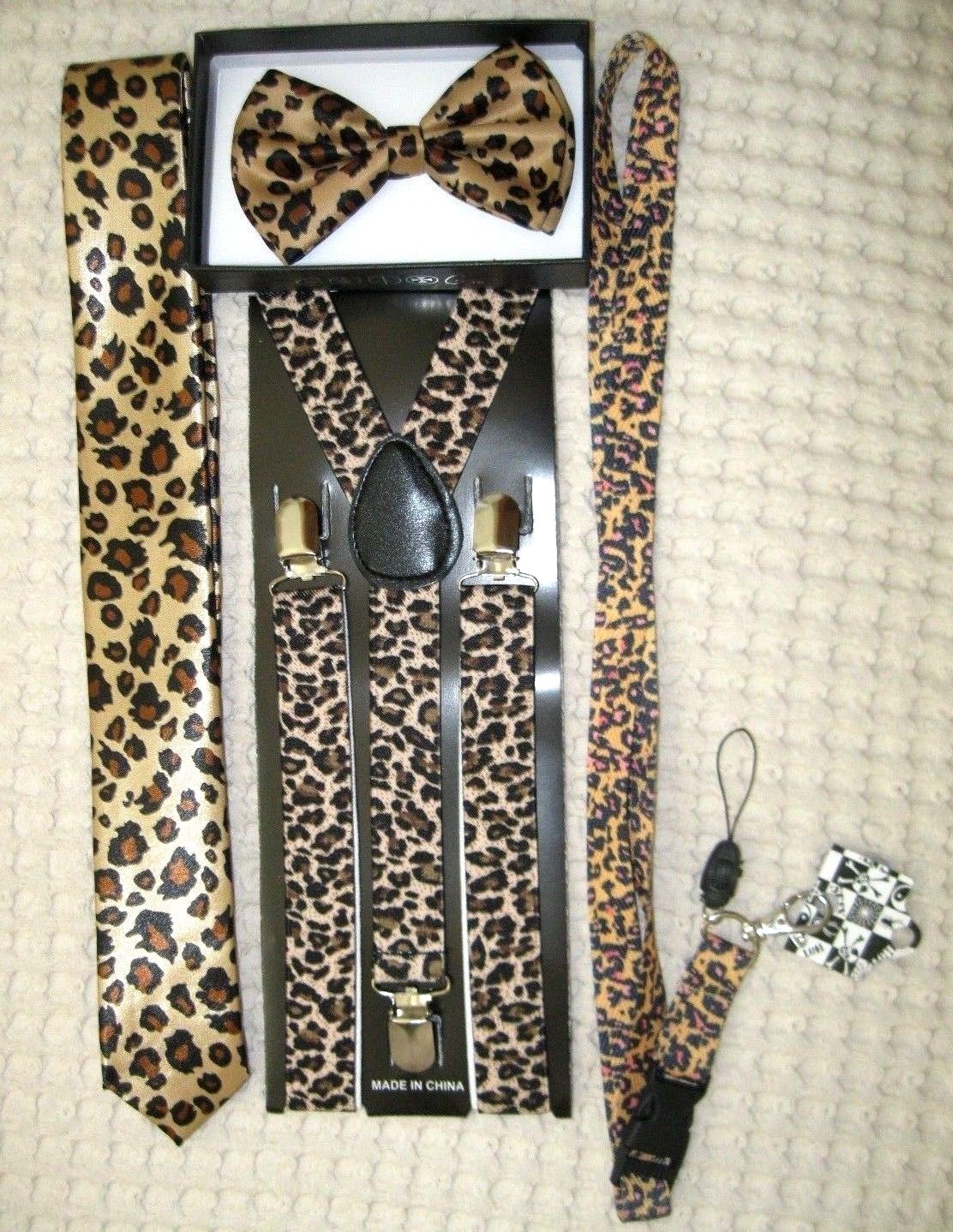 - UNISEX FASHION LEOPARD PRINT ADJUSTABLE ALL POLYESTER SILK BOW TIE,MATCHING NECK TIE, AND WIDE 1" ADJUSTABLE SUSPENDERS, AND LEOPARD PRINT ID HOLDER KEYCHAIN LANYARD COMBO-NEW IN FACTORY BOX!