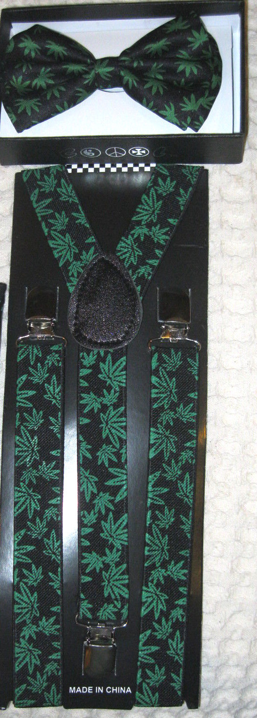 • UNISEX FASHION MARIJUANA MJ WEED LEAVES DESIGN ADJUSTABLE ALL POLYESTER SILK BOWTIE AND SUSPENDERS COMBO-NEW IN FACTORY BOX!