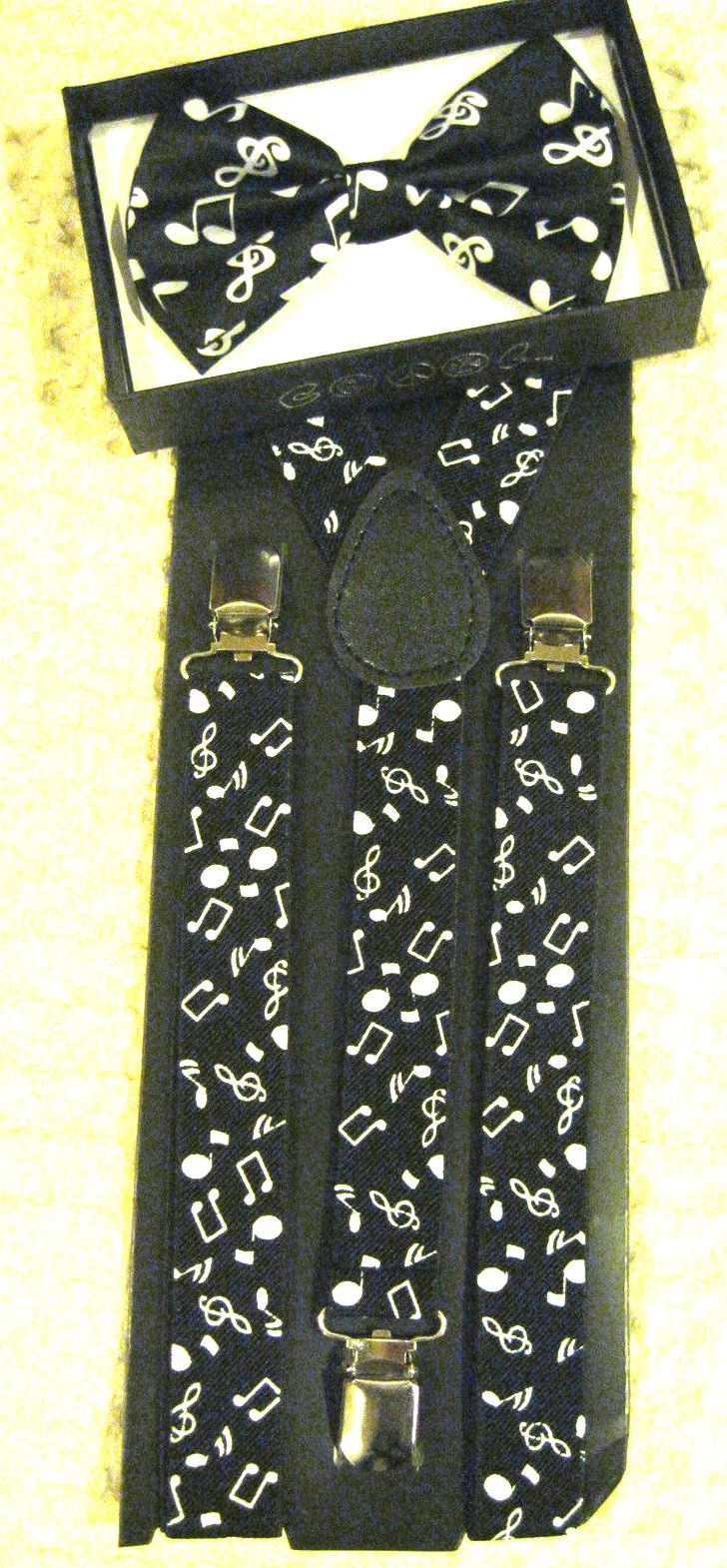 - UNISEX FASHION MUSICAL NOTES ADJUSTABLE ALL POLYESTER SILK BOW TIE AND SUSPENDERS COMBO-NEW IN FACTORY BOX!