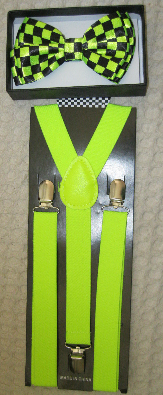 UNISEX FASHION SOLID NEON YELLOWISH GREEN CHECKERS CHECKERED TUXEDO ADJUSTABLE ALL POLYESTER SILK BOW TIE AND SOLID NEON YELLOW  ADJUSTABLE SUSPENDERS-NEW IN FACTORY BOX!